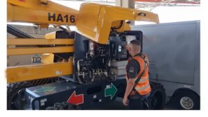 É responsabilidade do operador realizar a inspeção de pré-operação e a manutenção de rotina na plataforma. A inspeção de pré-operação é uma inspeção visual realizada